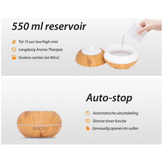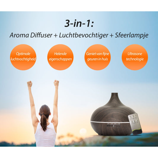 Ultrasone aroma diffusers maken gebruik van water en etherische olie om een fijne nevel te genereren die de lucht bevochtigt en tegelijkertijd de geur verspreidt. Dit betekent dat een aroma diffuser ook functioneert als luchtbevochtiger, waardoor droge lucht in huis verminderd wordt en je makkelijker kunt ademhalen. De vernevelaar werkt stil en is energiezuinig en dankzij de timerfunctie kun je precies instellen wanneer de diffuser moet werken.
